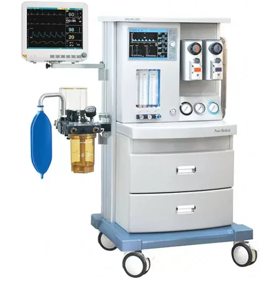 - Ventilateur d’anesthésie : écran TFT couleur 8,4 pouces intégré, capable d’afficher simultanément la pression-temps, la fréquence-temps, la pression-volume, la fréquence-volume et deux formes d’onde sur l’écran.