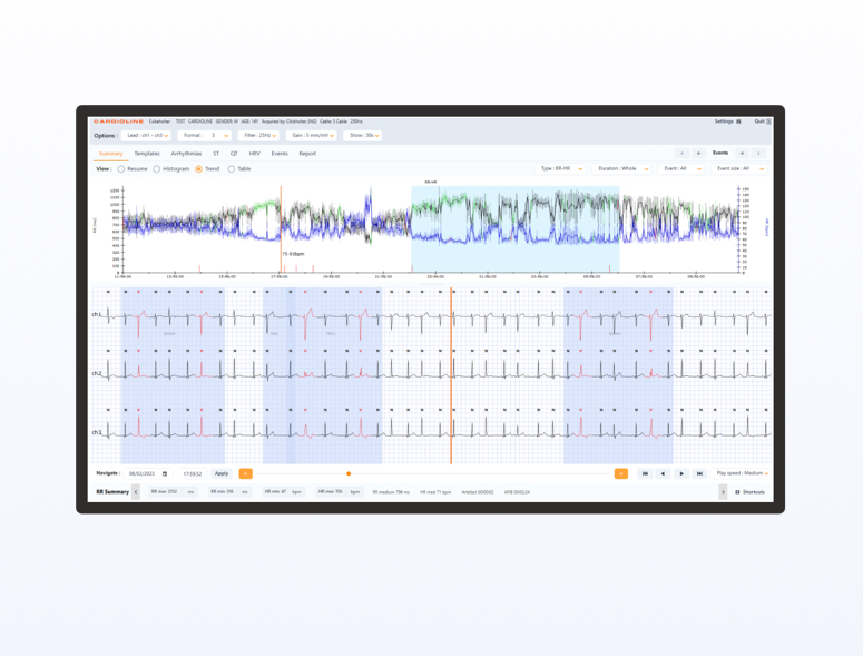 Rapports détaillés : Génère des rapports détaillés et visuels qui incluent des graphiques, des tendances et des événements significatifs, facilitant l’interprétation des données par les cardiologues.